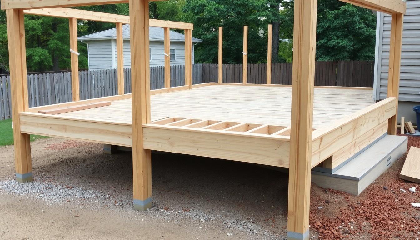 Design your deck layout, ensuring it meets local building codes. Remove any existing decking and inspect the underlying frame for support. Fill flaws in the wall with latex sealant to maintain waterproofing. Build the deck frame using appropriate lumber: 2x4s for joist beams, 2x6s for cross beams, and 4x6s or 6x6s for supporting beams. Position joists about 16 inches apart to enhance stability. For the foundations, dig holes for footings at least 3 feet deep, or 4 feet deep in colder climates. Fill the holes with concrete and set an 8' 6x6 post in each, ensuring each post is plumb and aligned with your string line. Let the concrete cure for at least 48 hours before proceeding with the installation.