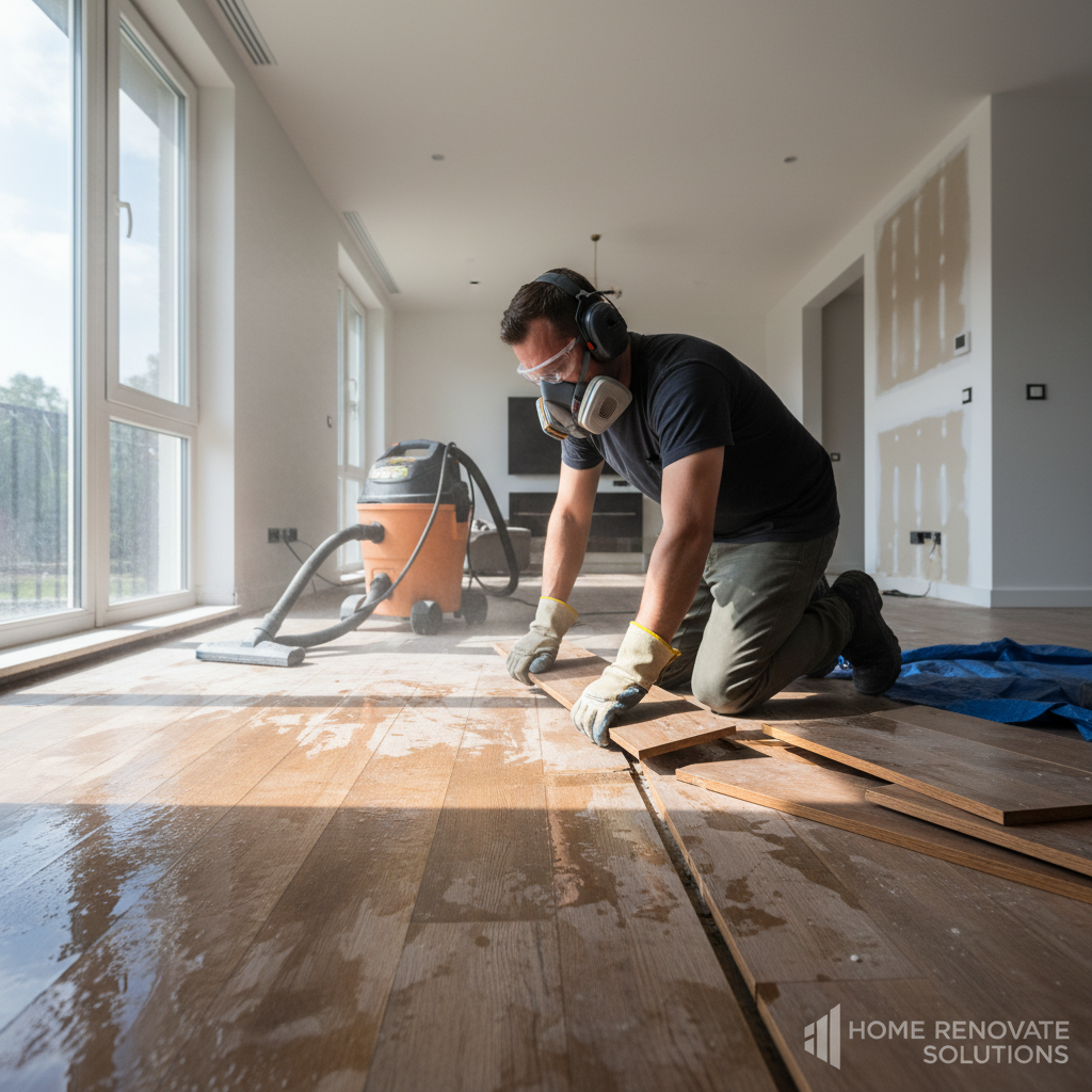First, stop the water source and turn off the power. Remove standing water and clear the area of furniture. Then, dry the flooring using fans and dehumidifiers to prevent further damage.