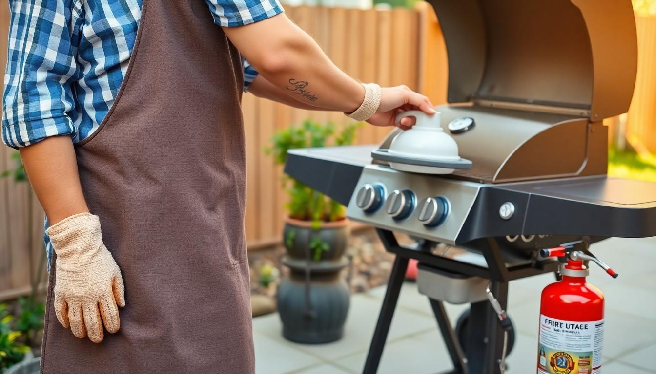 Ensure safety by inspecting propane tanks for leaks, maintaining a clean grill area, and keeping the grill at least 3 feet away from structures. Have a fire extinguisher nearby and wear fitted clothing to prevent accidents while grilling.