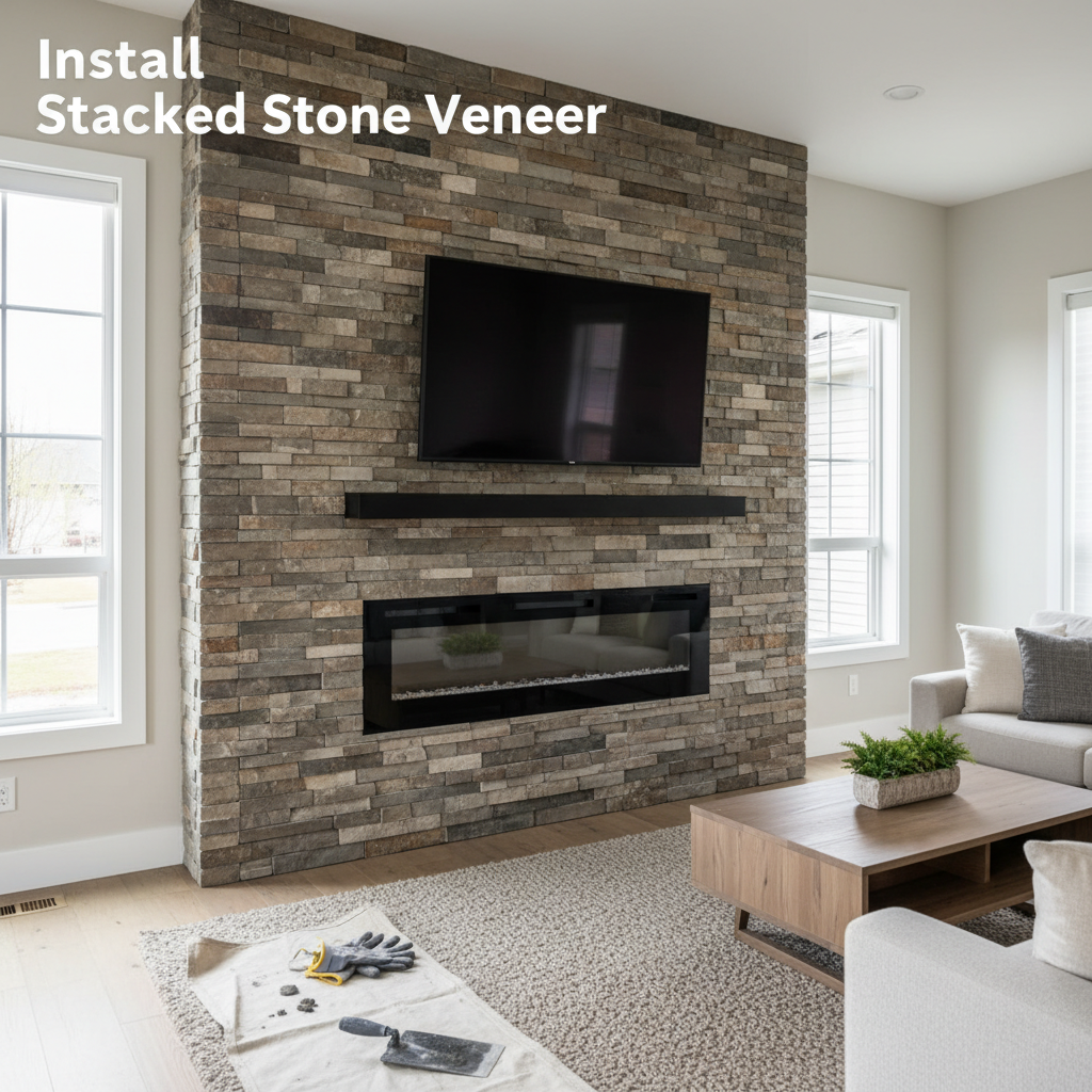 Essential tools include stacked stone panels, thin set mortar, a notched trowel, a level, a rubber mallet, grout, sponges, and safety gear. Proper tools ensure a smoother installation process.