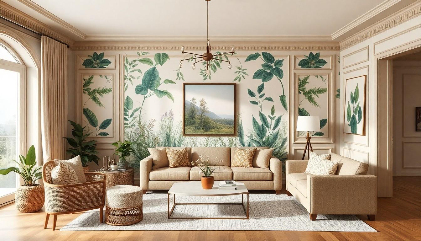 Biophilic design remains a leading trend, emphasizing a connection to nature through archival foliage wallpaper prints, botanical prints, natural landscapes, and hand-drawn illustrations. This trend promotes serenity and brings the outdoors indoors, creating an inviting atmosphere for your living space.