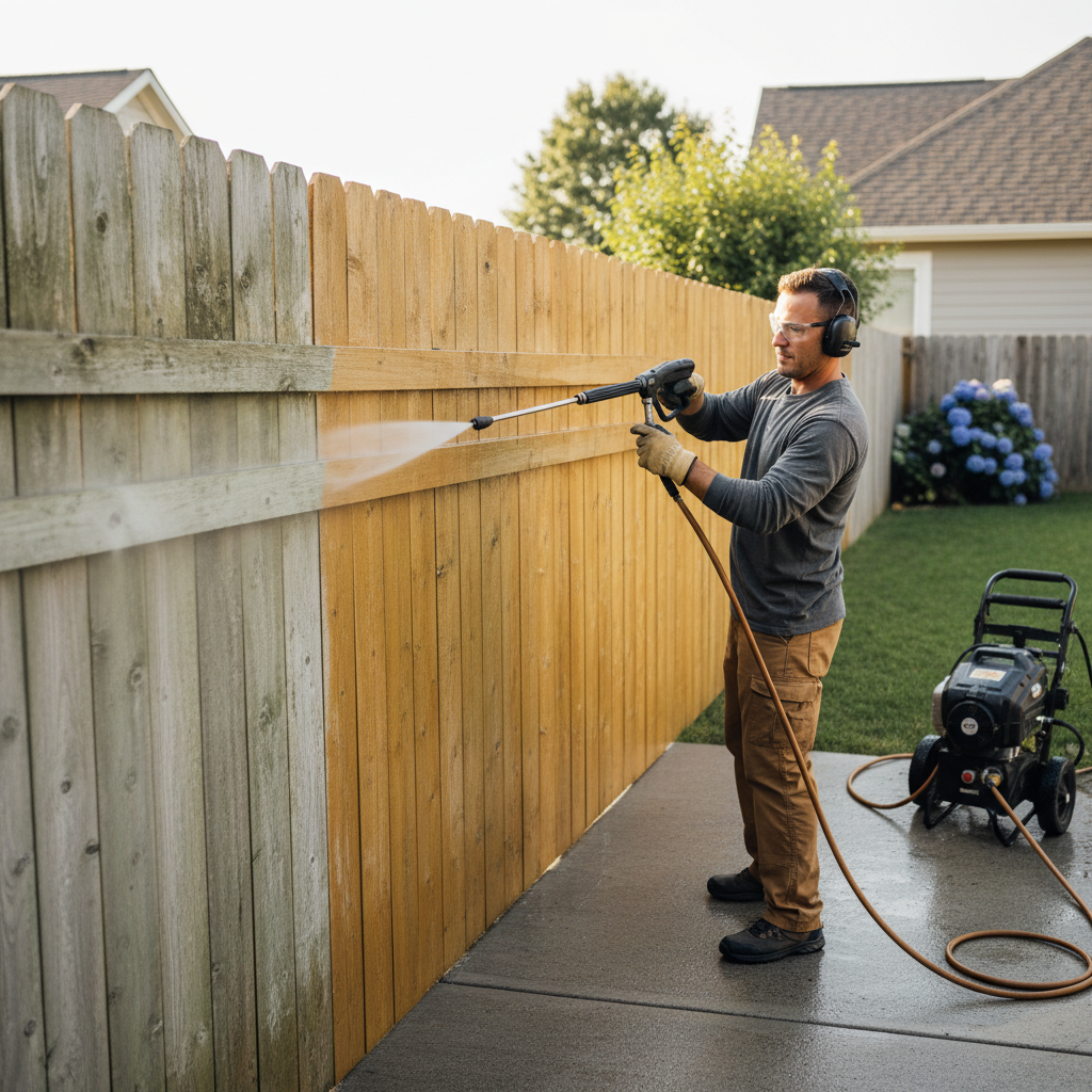 You should use a power washer with a pressure rating between 1500 and 3000 PSI. For wood fences, select a low-pressure nozzle to prevent damage during cleaning.