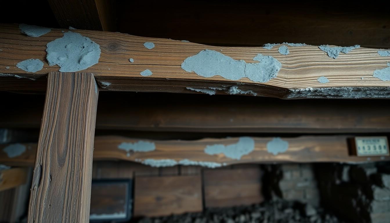 Signs of dry rot include patches of fungal growth (white or gray), deteriorating wood that looks dark or crumbly, and a musty odor near moisture sources.