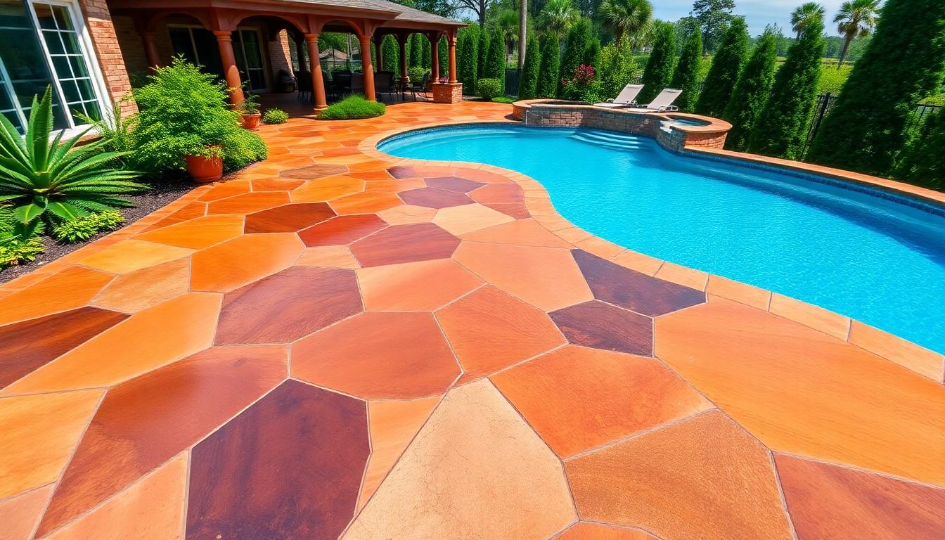Not only does stained concrete provide an attractive finish, but it’s also cost-effective. Depending on the design and complexity, you can expect to spend between $2 to $10 per square foot. This investment not only boosts your property’s value but also provides a slip-resistant surface that stands up to the elements. Dive into the world of stained concrete and discover how it can elevate your poolside experience.