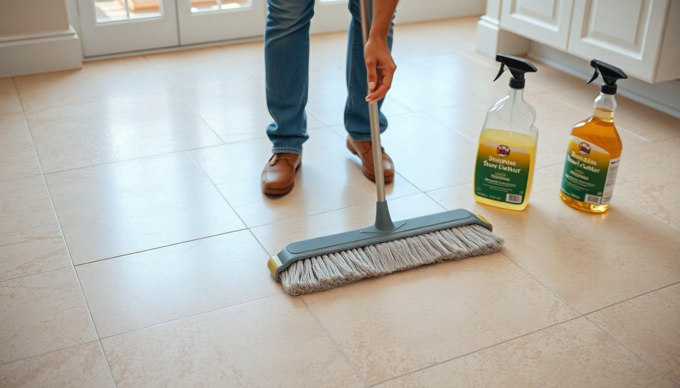 - Mop the floor with warm water mixed with a small amount of dish soap or a commercial stone tile cleaner specifically designed for natural stone. Ensure the mop is slightly damp to prevent water damage.