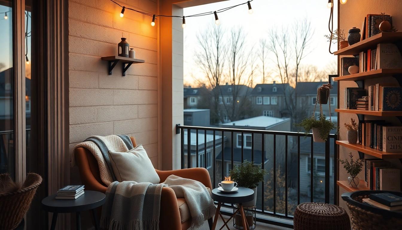 You can create a cozy retreat on your balcony by adding vertical gardens with hanging planters, bistro tables for a café feel, and string lights for atmosphere. Consider foldable furniture for flexibility and portable fire pits for chilly evenings, or even a small inflatable hot tub for a bold touch.