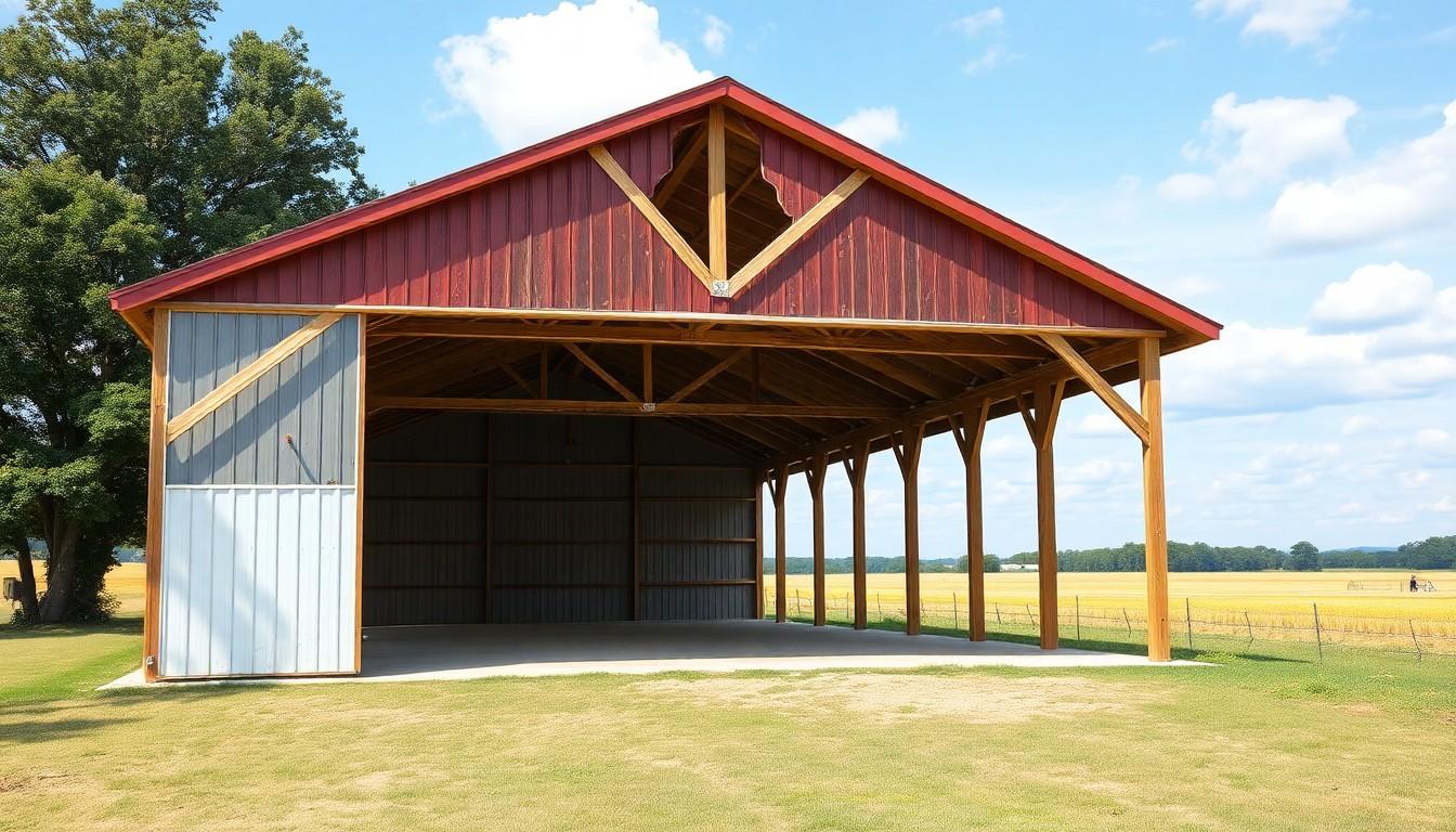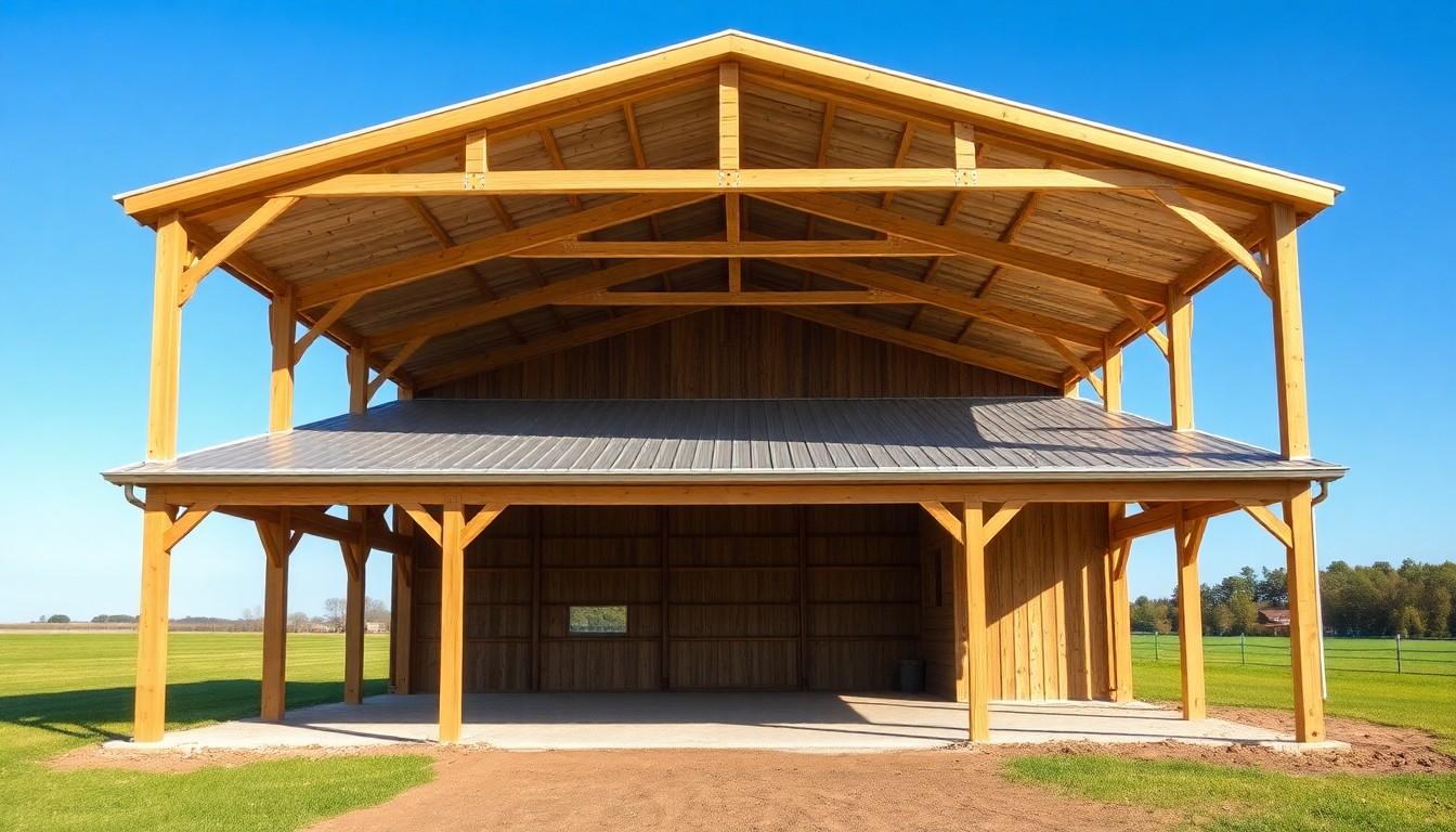 Wood serves as the primary structural component in pole barn construction, typically using pressure-treated lumber for the vertical poles. This treatment enhances resistance to rot and insect damage. You may also choose engineered wood products like laminated veneer lumber for added strength. Steel components, such as metal roofing and siding, provide a robust exterior that withstands harsh weather and reduces maintenance needs. Galvalume, a steel coated with aluminum and zinc, offers enhanced corrosion resistance, ensuring a longer lifespan for barn structures.